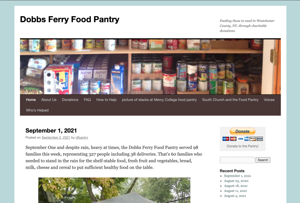Dobbs Ferry Food Pantry is located in Dobbs Ferry, NY, hosted in South Presbyterian Church. The pantry serves over 60 residents and counting since the pandemic. While the food pantry is a staple of the community, like all nonprofits, much of its resources must come volunteers and donations.